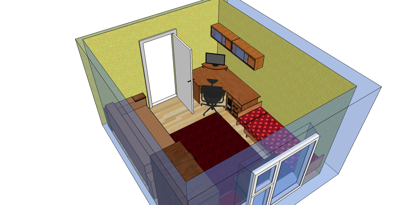 Пересмотрев несколько программ: бесплатных и не очень, наткнулся на бесплатную софтинку от Google: SketchUp 8. И как говорится "вот она рыба моей мечты": интуитивно понятно, просто, удобно и самое главное красиво). Кроме стандартных заготовок есть готовые объекты, сделанные пользователями (софа и стулья не рисовались). В общем очень понравился результат)